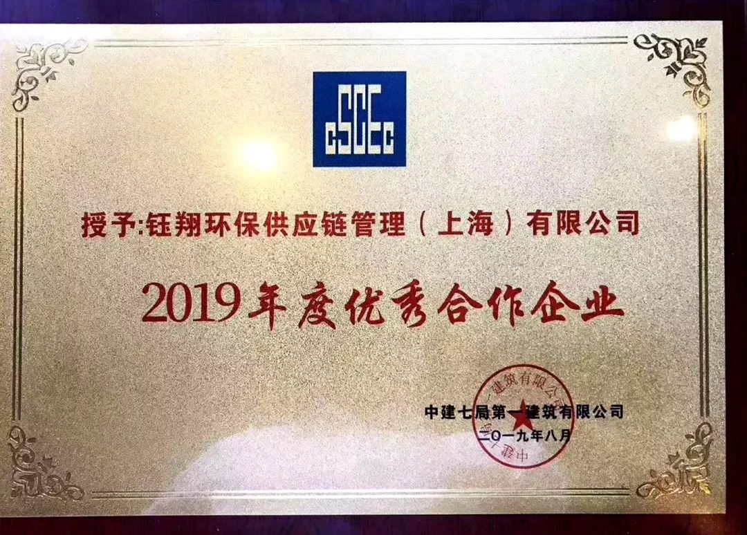 近日,鈺翔環(huán)保供應(yīng)鏈管理(上海)有限公司被中建七局第一建筑有限公司評(píng)為2019年度優(yōu)秀合作企業(yè)。